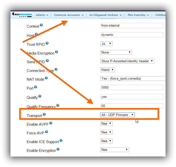 Per extensie kan men kiezen uit welk protocol een extensie kan of mag gebruiken. Een combinatie van TCP en UDP is ook mogelijk: