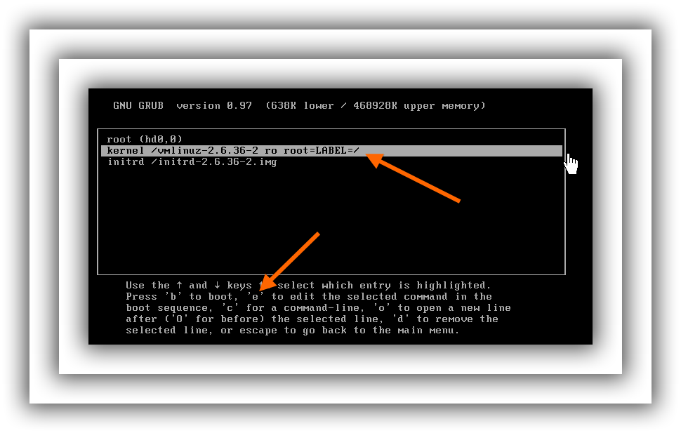 - Kies de 'kernel .... ' lijn en toets weer 'e' van edit/bewerken.